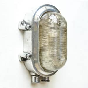 Ancienne applique d’usine en fonte d’aluminium poli, très jolie verre strié offrant une élégante lumière. Système d’ouverture “portefeuille”. Entièrement restaurée et ré électrifiée. A poser à l’horizontal ou à la vertical ! anciellitude