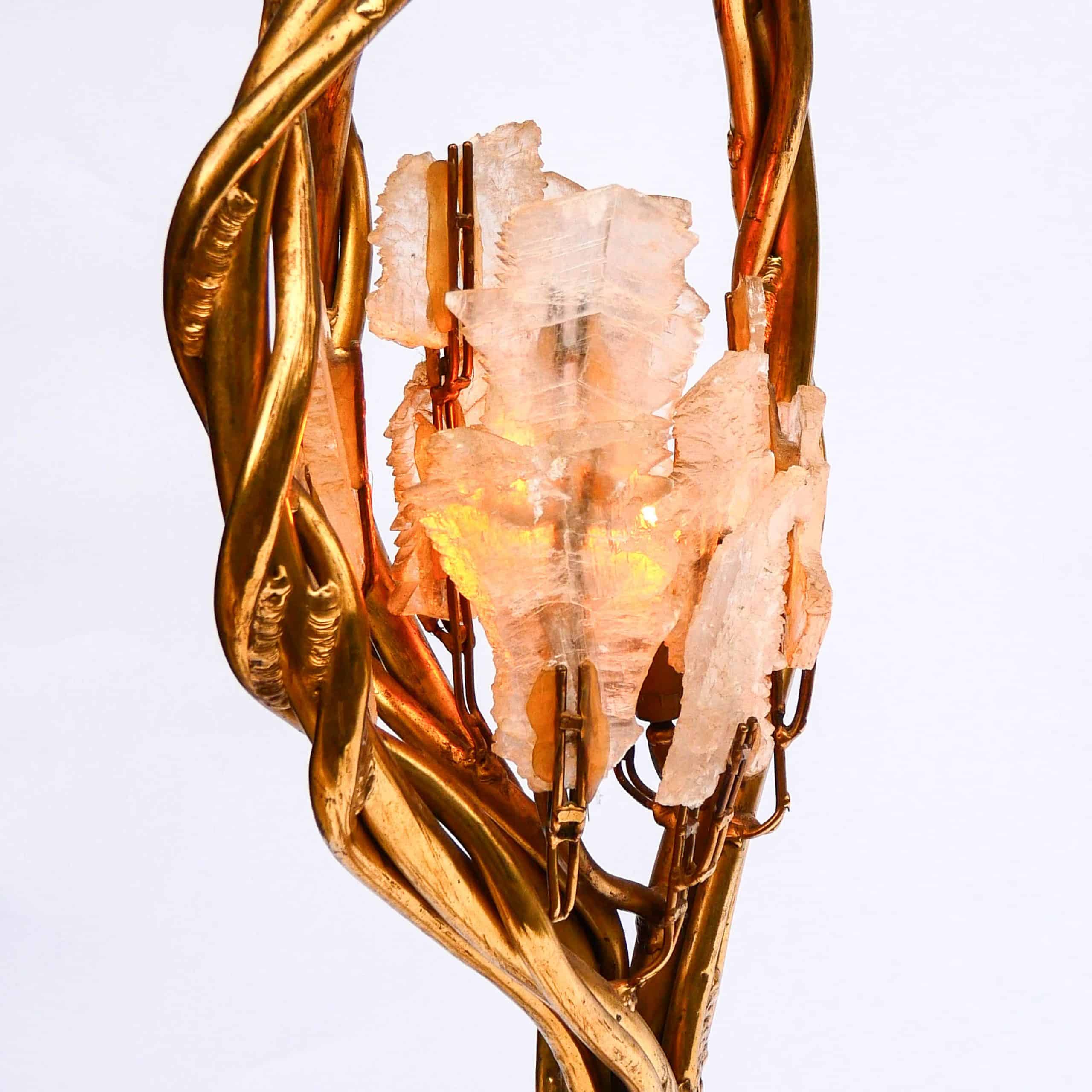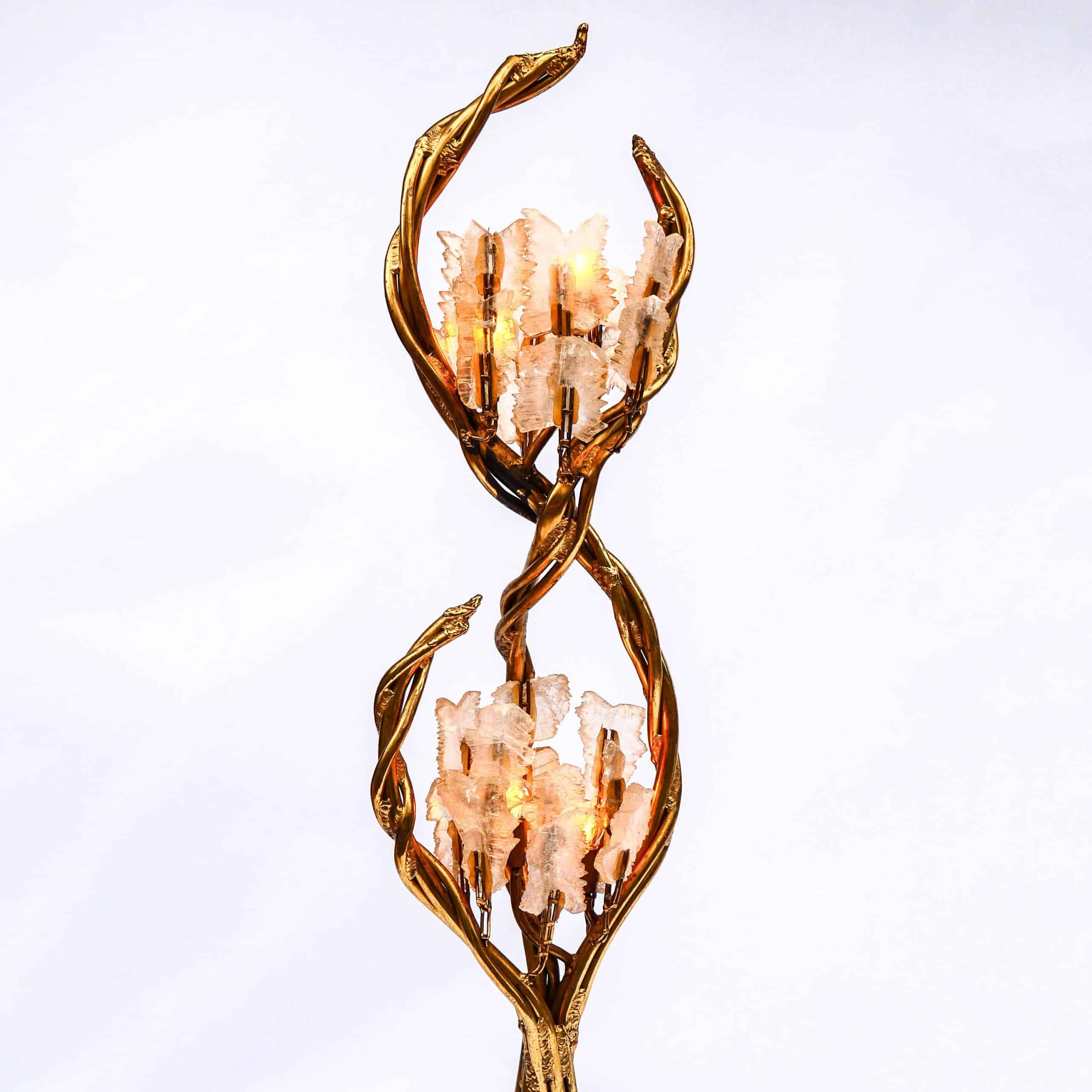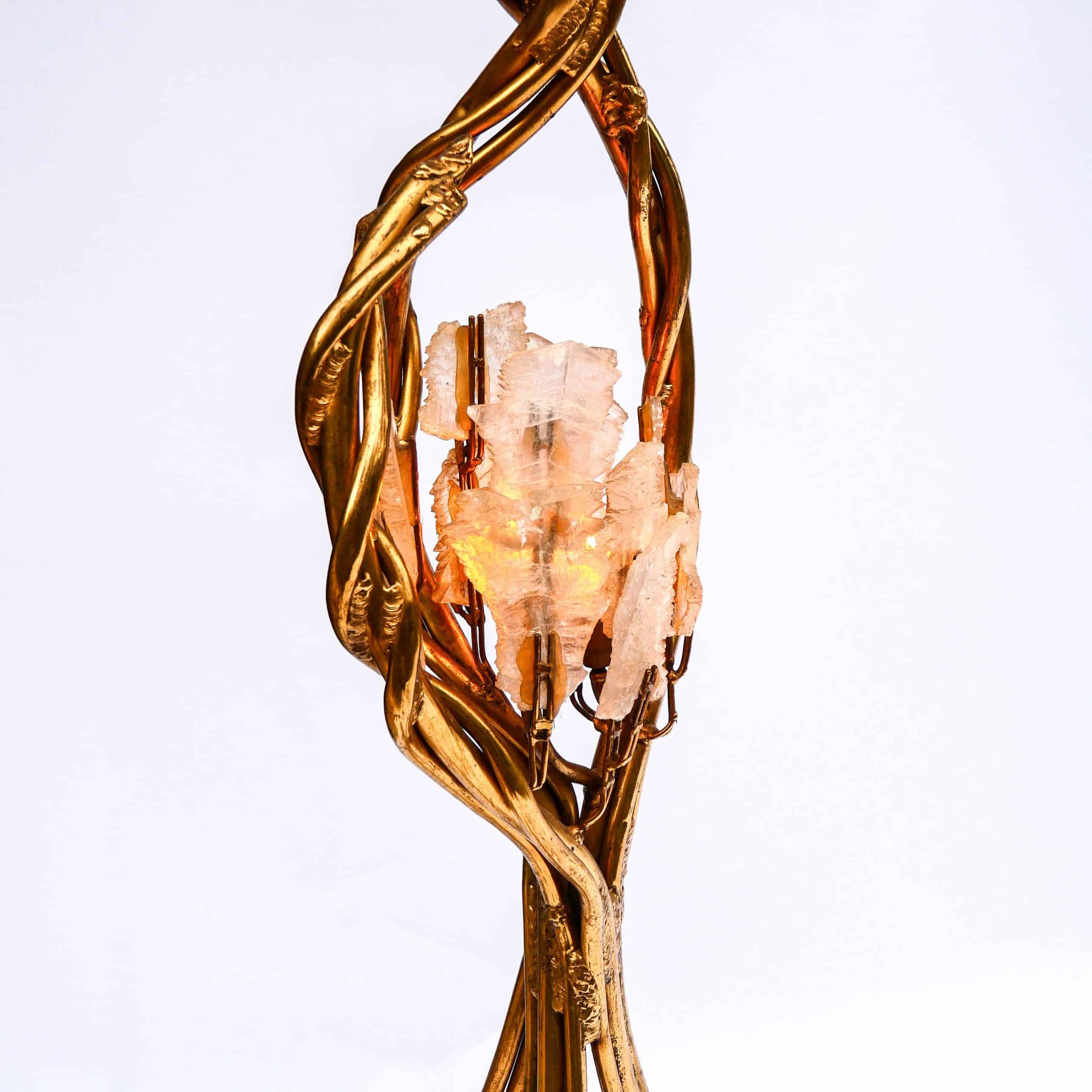 La structure en laiton doré imite des tiges entrelacées, à la manière de lianes ou de branches végétales, soutenant deux bouquets de lumière ornés de cristaux de roche translucides, diffusant une lumière douce et précieuse. Le design évoque à la fois le monde végétal et le bijou, dans un esprit baroque et théâtral propre au travail de Fernandez.
