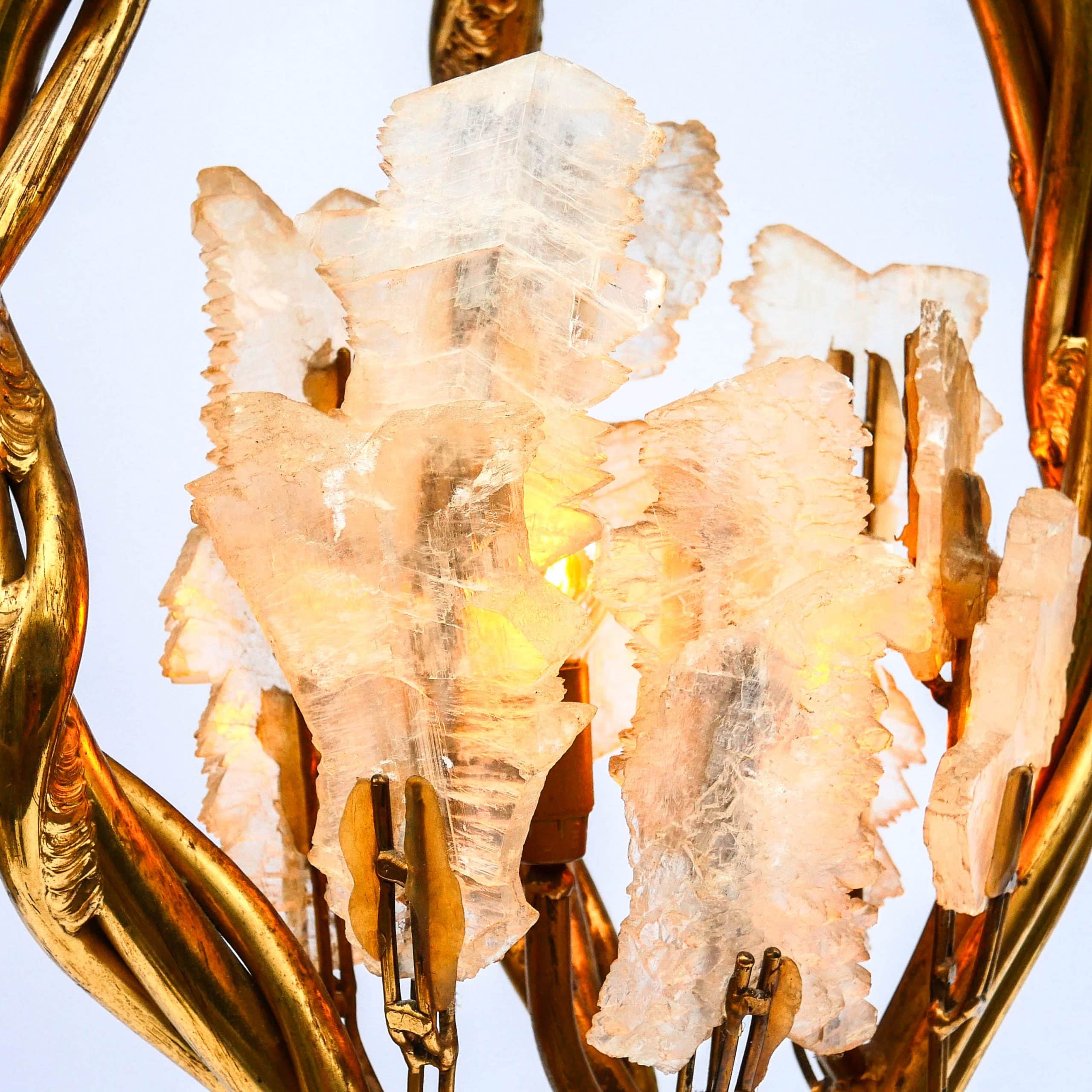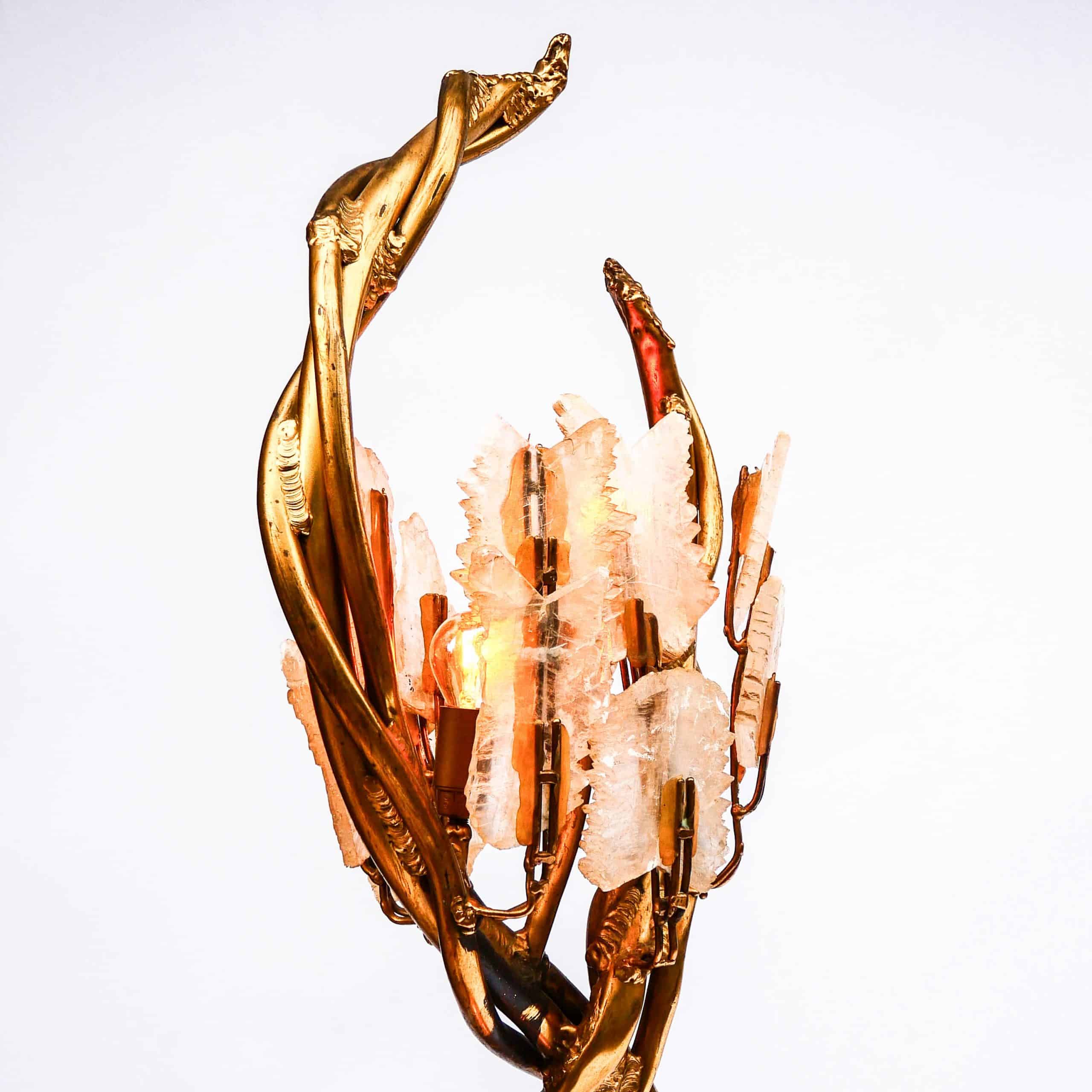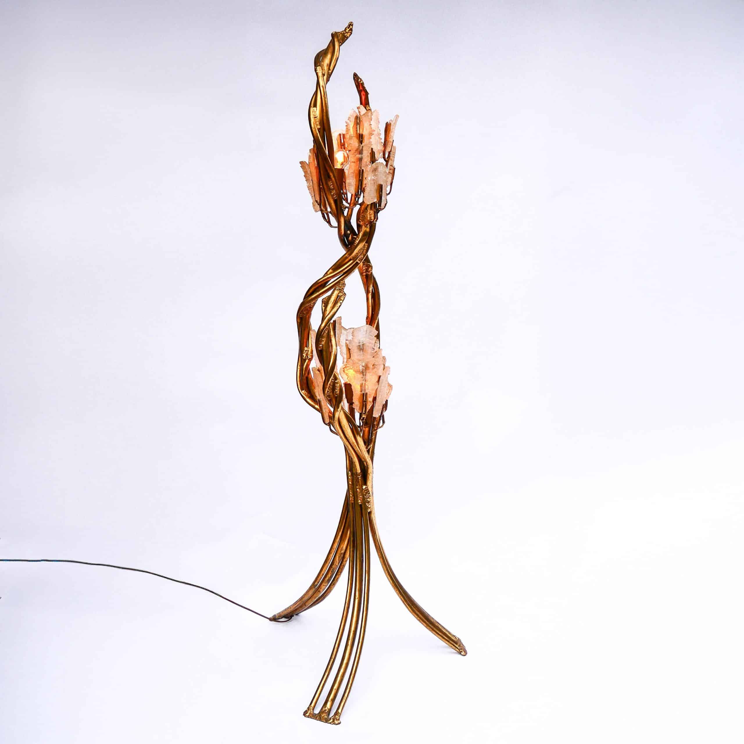 La structure en laiton doré imite des tiges entrelacées, à la manière de lianes ou de branches végétales, soutenant deux bouquets de lumière ornés de cristaux de roche translucides, diffusant une lumière douce et précieuse. Le design évoque à la fois le monde végétal et le bijou, dans un esprit baroque et théâtral propre au travail de Fernandez.