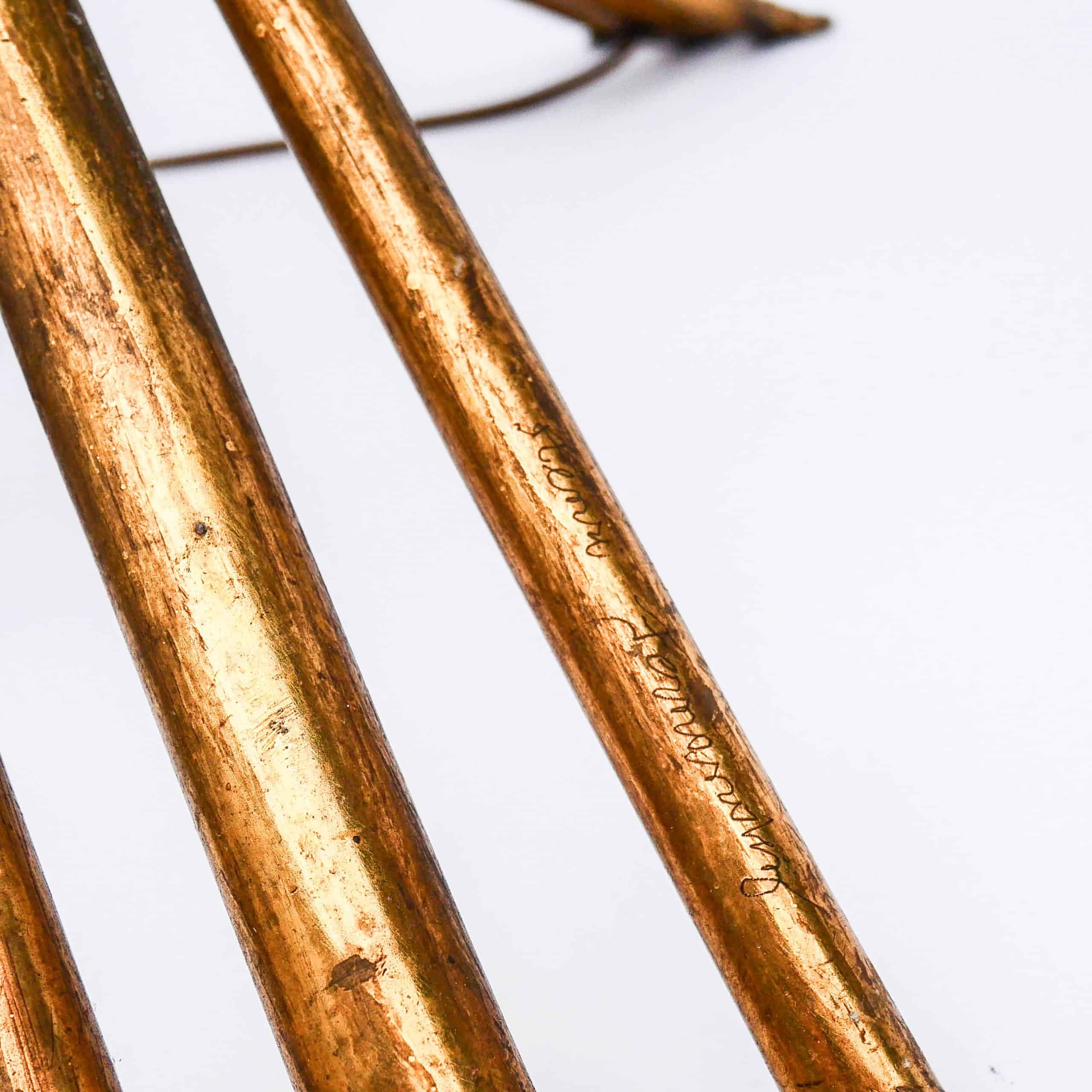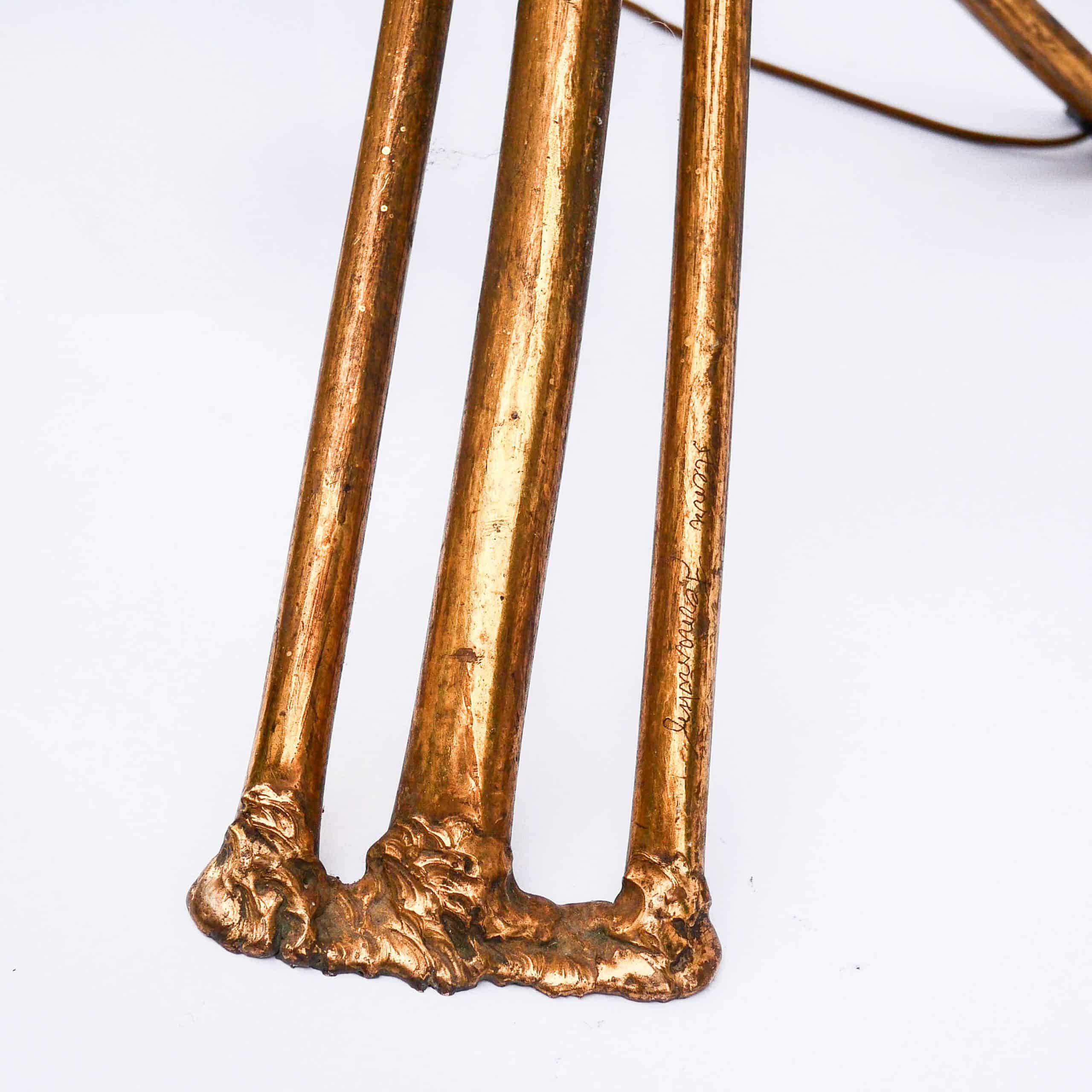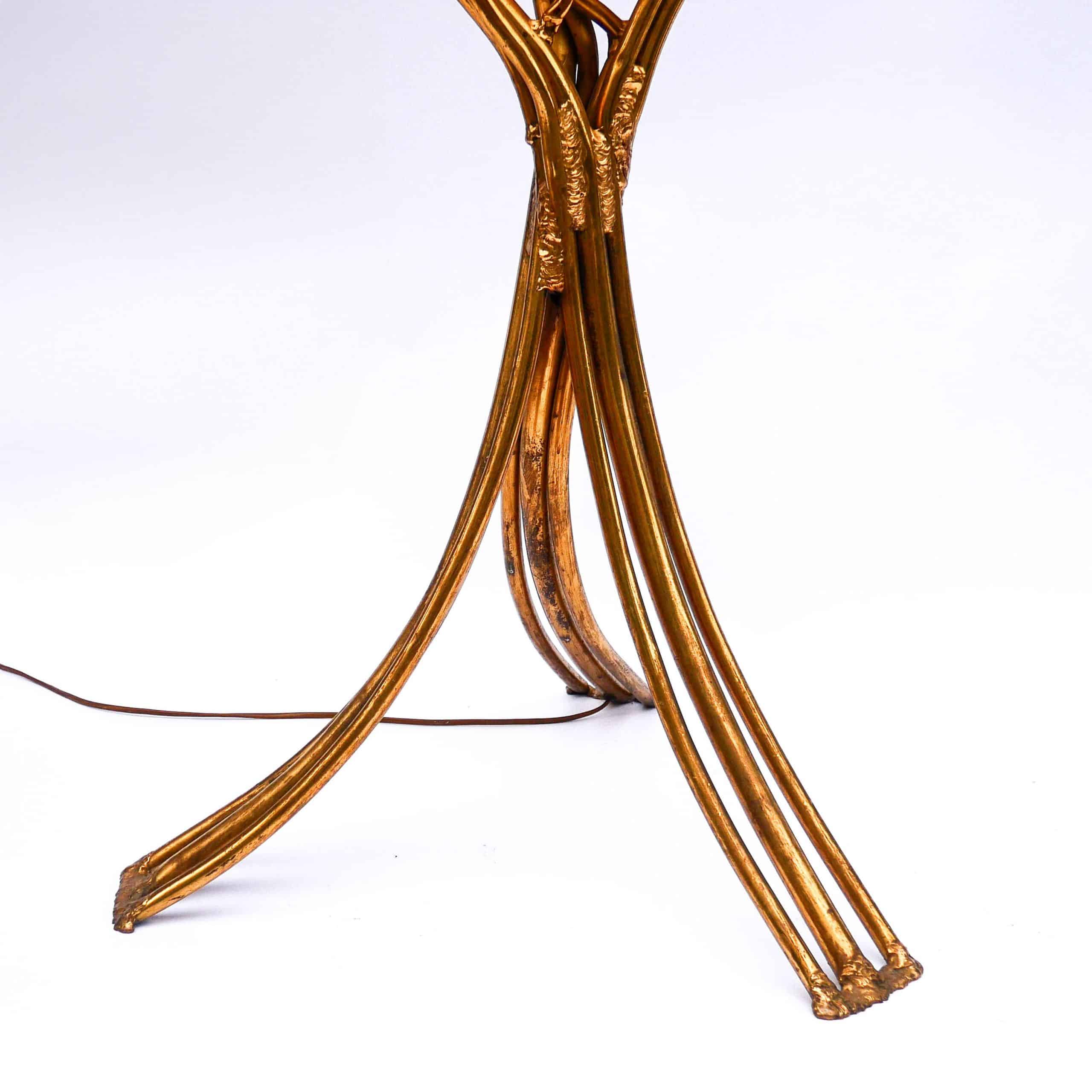 Étonnant lampadaire sculptural à deux feux, signé Henri Fernandez, artiste français actif dans les années 1970 et connu pour ses créations en bronze doré et laiton aux formes organiques et luxuriantes.