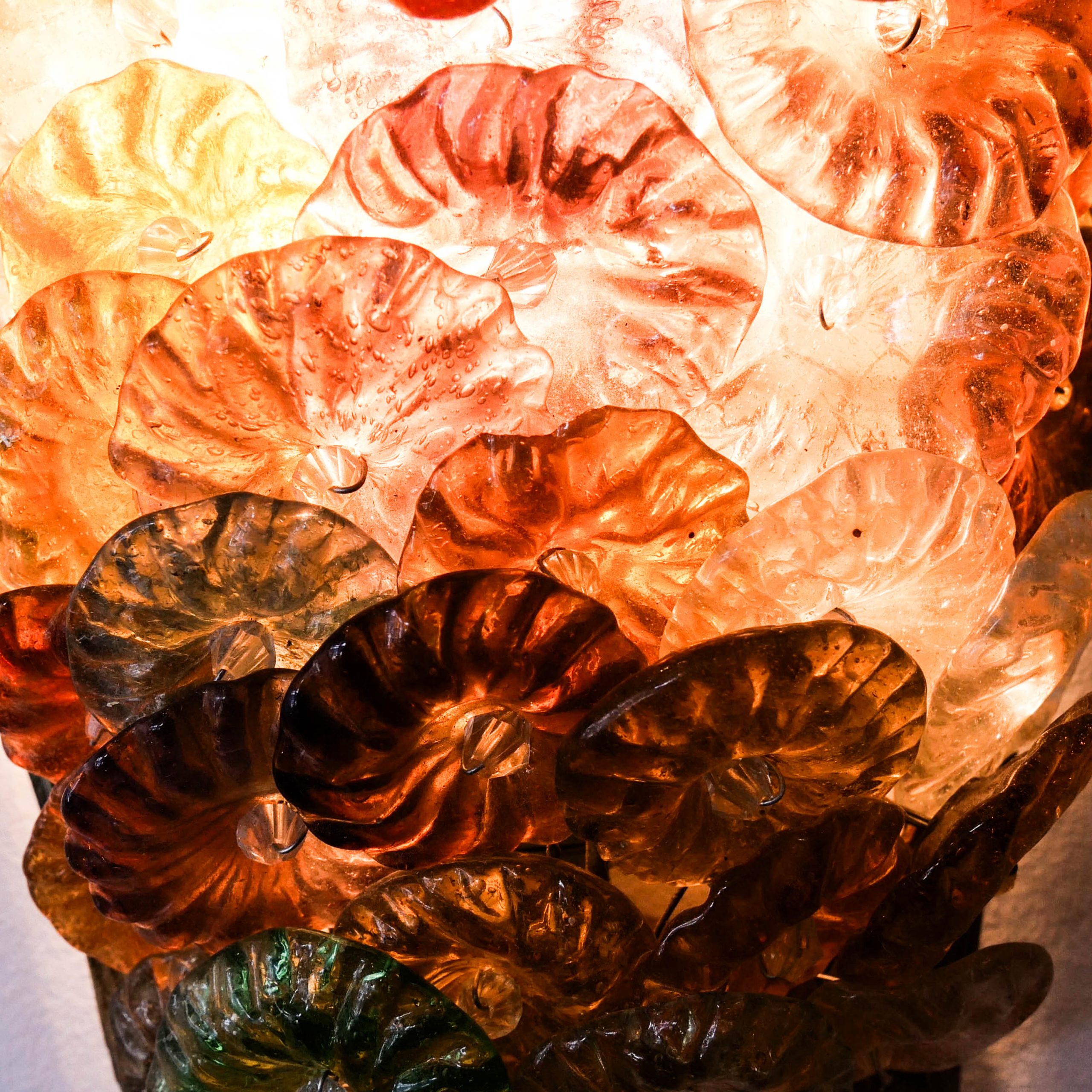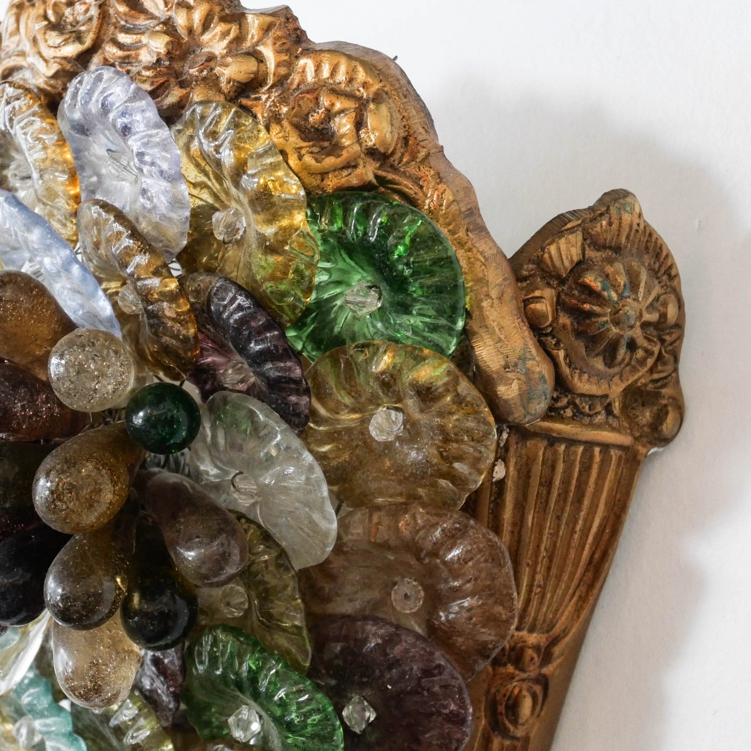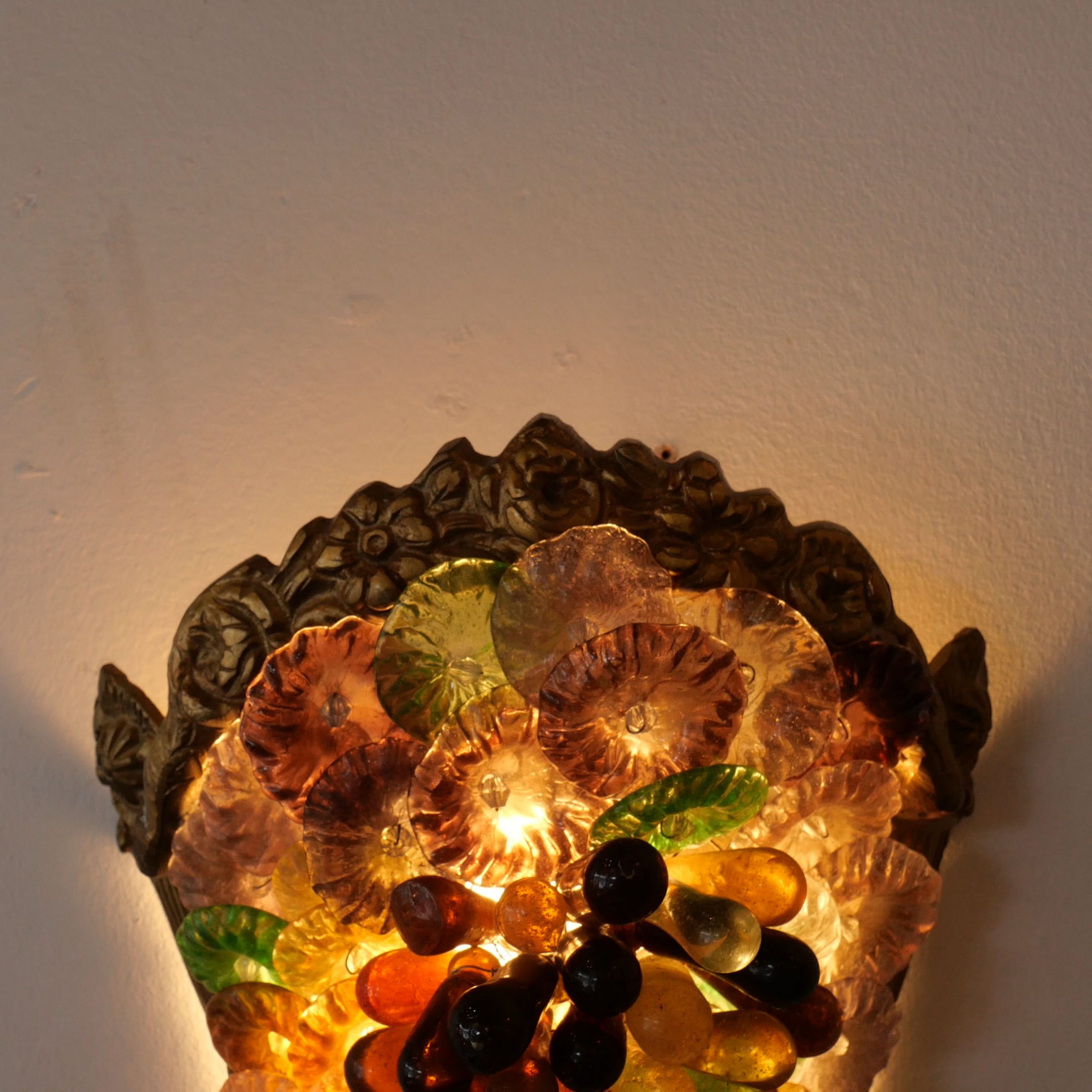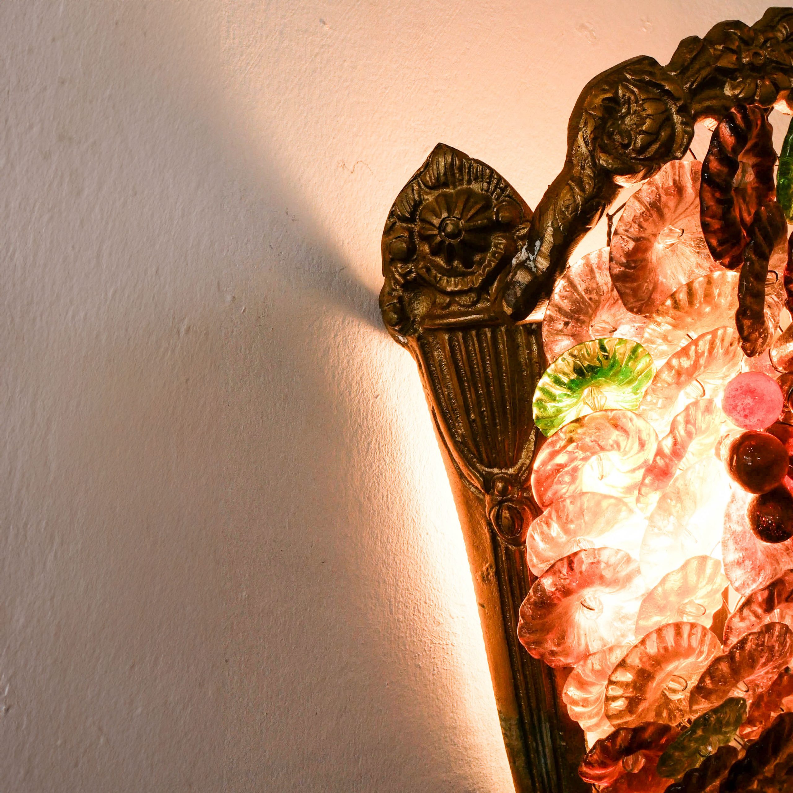 Cette spectaculaire paire d’appliques murales incarne l’exubérance et le savoir-faire des maîtres verriers de Murano du début des années 1980. Conçues en forme de cornes d’abondance stylisées, elles présentent un foisonnement organique de fleurs délicates, de gouttes cristallines et de perles de verre aux nuances vibrantes de bleu cobalt, d’ambre et de rose poudré. Chaque élément de verre est magistralement fixé sur une structure en métal doré, créant une texture riche et complexe qui évoque un jardin de cristal suspendu.