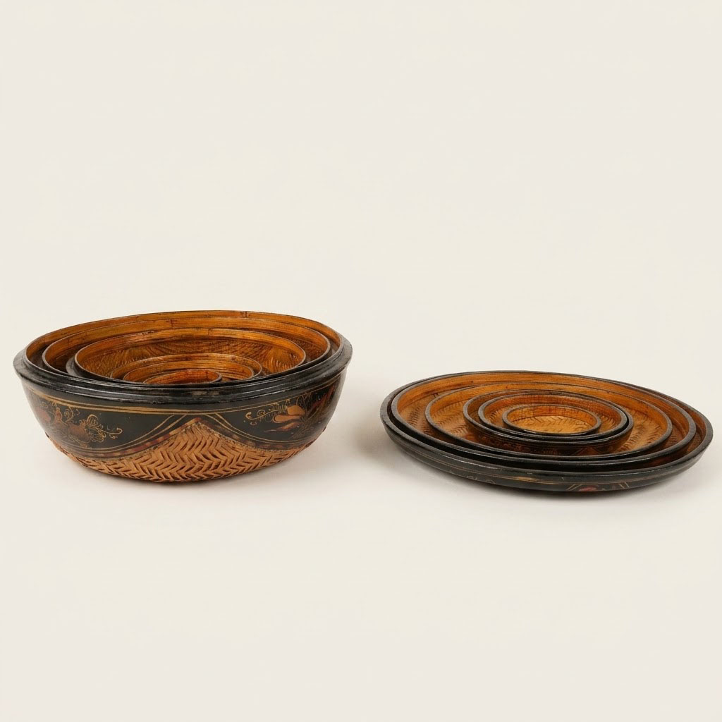 Suite de 6 Boîtes Gigognes en Bambou Tressé et Laque Polychrome – Travail d’Indochine Mi-XXe